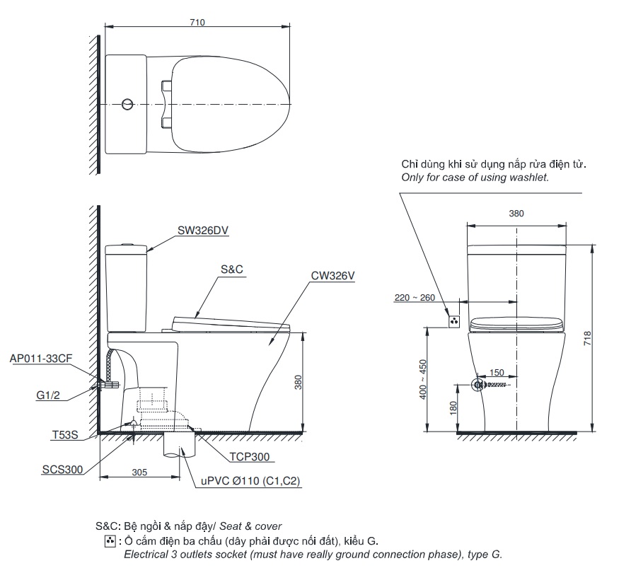 Thông số kỹ thuật Bàn cầu TOTO CS326DW16 nắp rửa điện tử WASHLET TCF23410AAA: