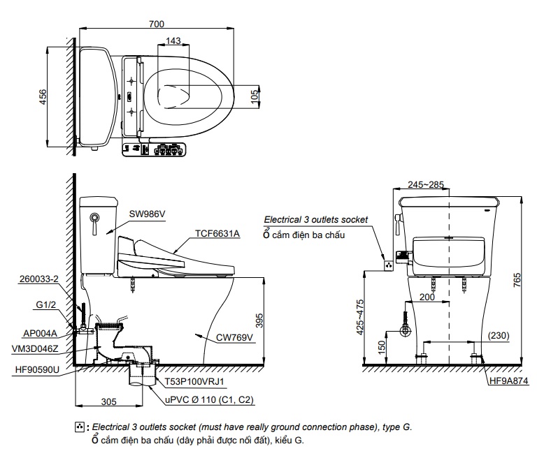 Thông số kỹ thuật Bàn cầu TOTO CS986GW7 nắp rửa điện tử WASHLET:
