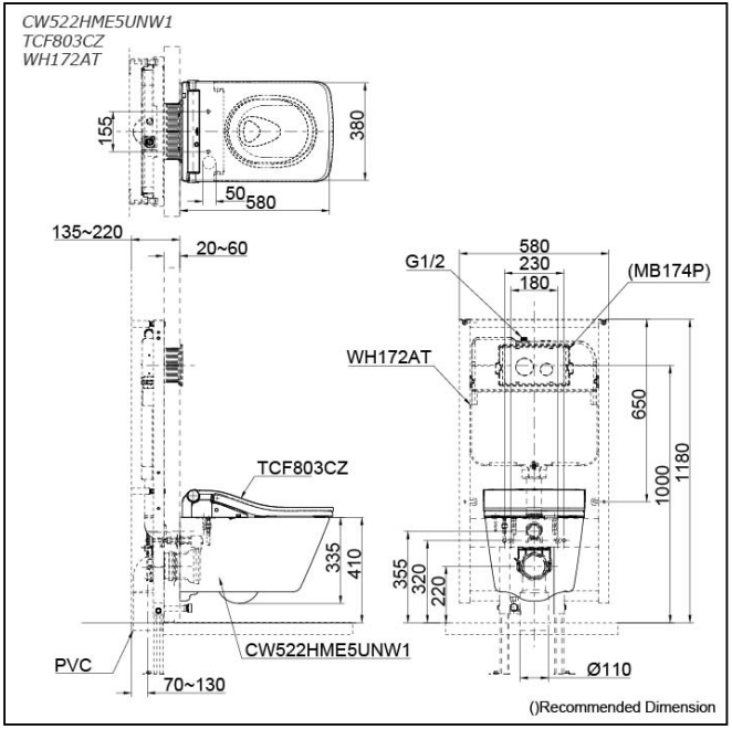 Thông số kỹ thuật Bàn cầu TOTO CW522EA-TCF803CZ-WH172AT nắp điện tử washlet
