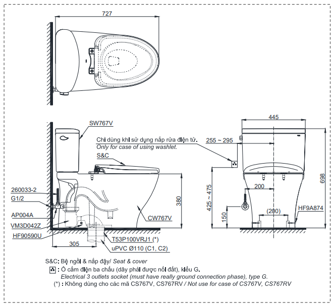 Thông số kỹ thuật Bồn cầu TOTO CS767RW11 nắp rửa điện tử WASHLET TCF4911Z