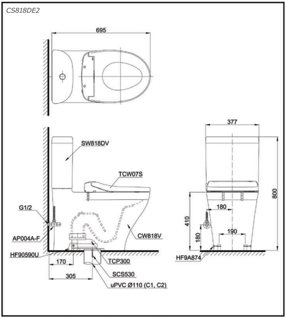 Thông số kỹ thuật Bồn cầu TOTO CS838DE2 nắp rửa cơ TCW07S Ecowasher