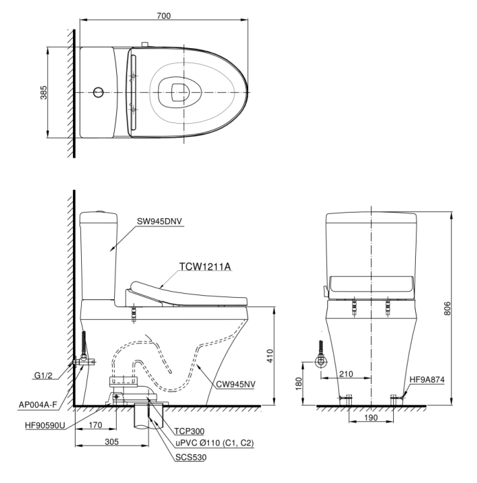 Thông số kỹ thuật Bồn cầu TOTO CS945DNE4 nắp rửa cơ TCW1211A