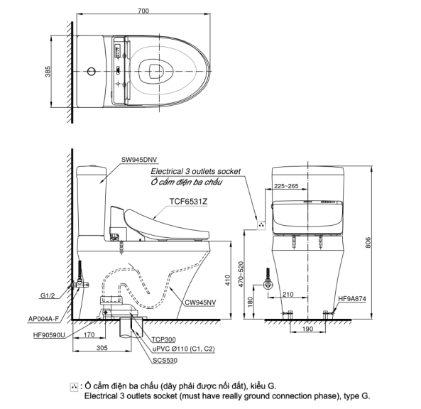 Thông số kỹ thuật Bồn cầu TOTO CS945DNW6 nắp rửa điện tử WASHLET