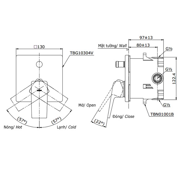 – TBG10304V: Van điều chỉnh nước nóng lạnh kèm nút chuyển hướng và phụ kiện âm tường