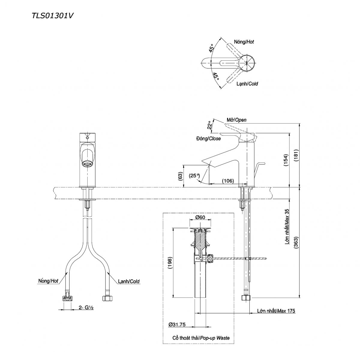 Bản vẽ kỹ thuật vòi nước TOTO TLS01301 V nóng lạnh