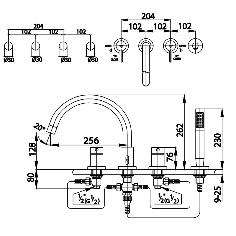– Bộ sen vòi trên bồn tắm 4 lỗ nóng lạnh gắn bồn kèm sen tắm